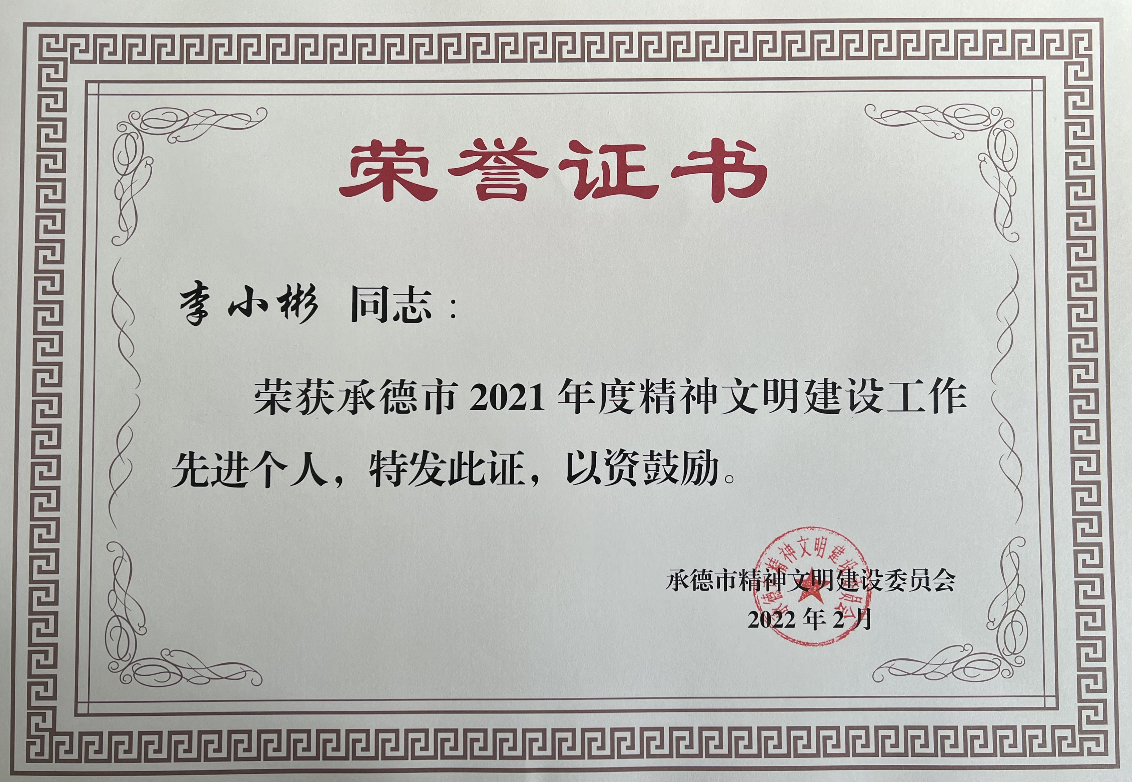 近日,承德市精神文明建設(shè)委員會公布2021年度全市精神文明建設(shè)工作先進(jìn)單位和先進(jìn)個人名單。我校榮獲2021年度“全市精神文明建設(shè)工作先進(jìn)單位”榮譽(yù)稱號,黨委宣傳統(tǒng)戰(zhàn)部副部長李小彬榮獲2021年度“全市精神文明建設(shè)工作先進(jìn)個人”榮譽(yù)稱號。 (點(diǎn)擊每張圖片即可查看其原圖)