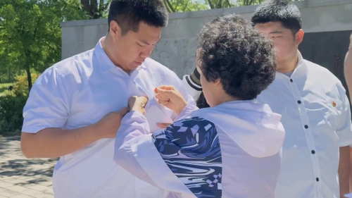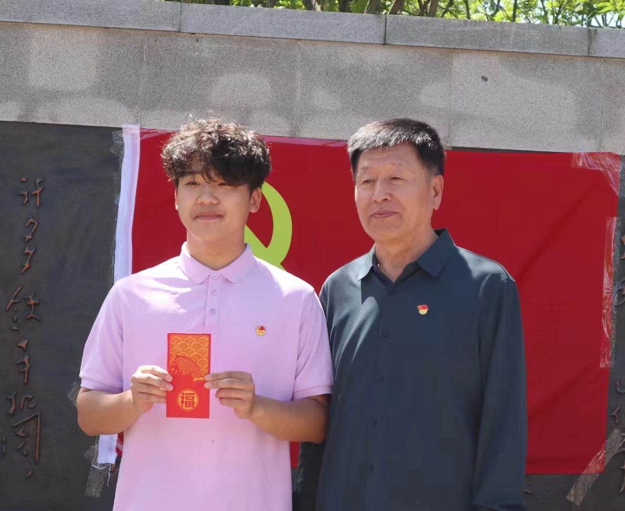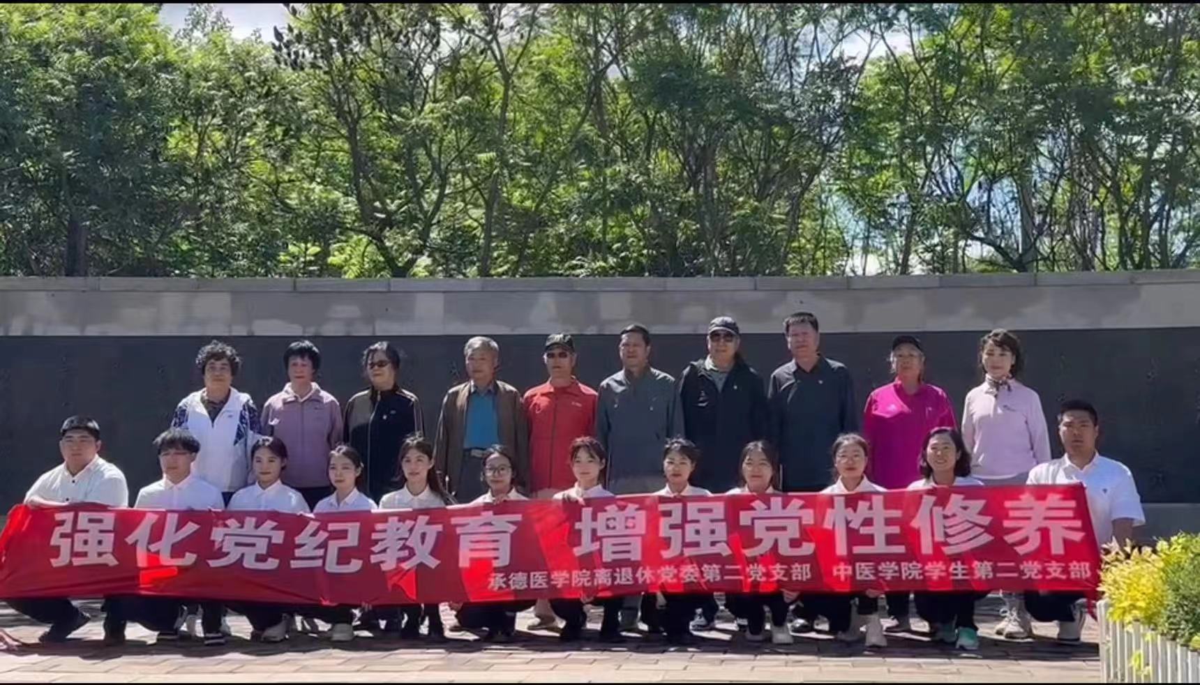 為弘揚(yáng)黨的光榮傳統(tǒng),強(qiáng)化黨員意識(shí),增強(qiáng)黨性修養(yǎng),2024年5月26日上午,承德醫(yī)學(xué)院老干部處黨委第二黨支部和中醫(yī)學(xué)院學(xué)生第二黨支部22人前往承德縣朝梁子村“毛主席按語(yǔ)紀(jì)念碑”廣場(chǎng),聯(lián)合開(kāi)展了“強(qiáng)化黨紀(jì)教育 增強(qiáng)黨性修養(yǎng)”黨紀(jì)學(xué)習(xí)主題黨日活動(dòng)。老干部處黨委第二黨支部委員李秀琴老師主持黨日活動(dòng)。 薪火相傳——老黨員為新黨員佩戴黨徽