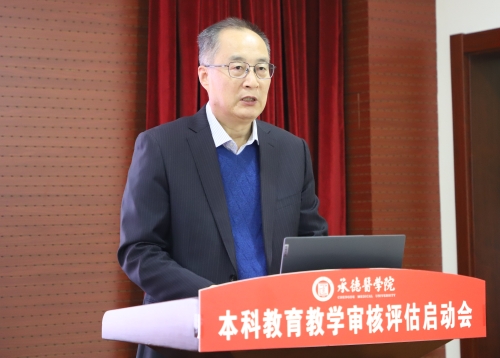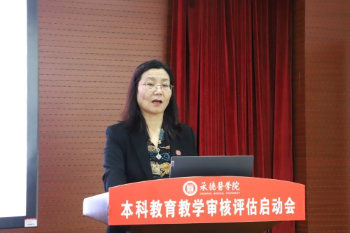 專家組組長聞德亮教授介紹審核評估相關事宜 王瑞婷作了題為《八秩薪傳 醫路致遠—在辦好人民滿意的教育征途上砥礪前行》的工作報告。報告系統梳理和展示了學校的紅色底蘊,四貫通四結合大思政育人體系,以立德樹人為根本,通過打造特色學科、深化教育教學改革、優化辦學條件,在人才培養與科學研究方面取得的顯著成效。這些舉措有力推動了學校綜合辦學實力的全面提升。她表示,學校將以此次本科教育教學審核評估為契機,持續鞏固和強化人才培養中心地位和本科教育教學核心地位,將外部質量保障與內部質量保障相結合,推進本科教育教學高質量發展,進一步提升我校服務經濟和健康事業發展的能力,為落實“教育強國”“健康中國”戰略貢獻承醫力量。